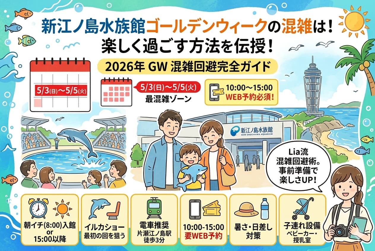 先に結論を言うと、2026年GWの新江ノ島水族館は5月3日〜5日が最混雑ゾーンで、しかも10時〜15時はWEB入場予約が必要です。