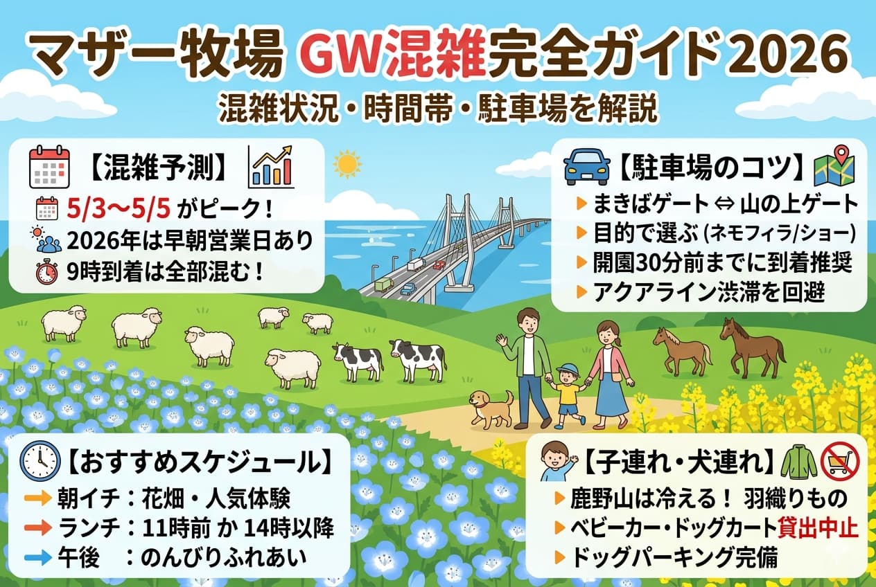 マザー牧場のゴールデンウィークは、毎年「どれくらい混むの?」「何時に行けばいいの?」と気になる人が多い人気シーズンです。