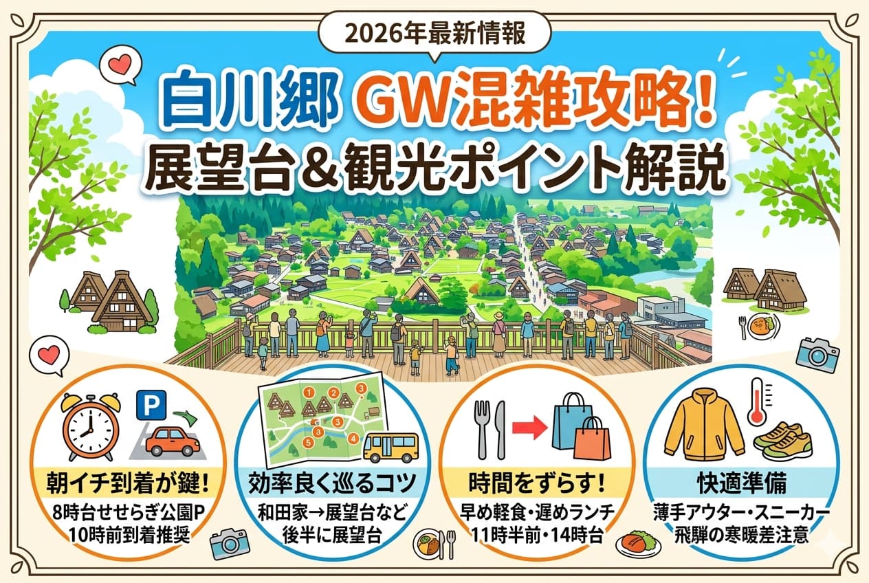 私はこういう日並びの年は、「行くなら朝」「できれば連休ど真ん中を外す」がいちばん効くと感じます。白川郷は景色を楽しむ場所なので、渋滞で体力を削られるともったいないです。