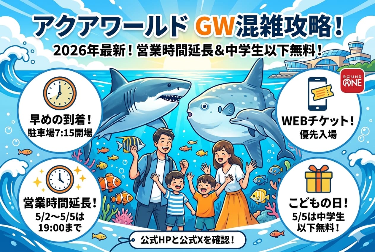 2026年のアクアワールドGWは、5月2日〜5日に19時まで延長営業、5月5日は中学生以下無料という、かなり魅力の大きい内容になっています。
