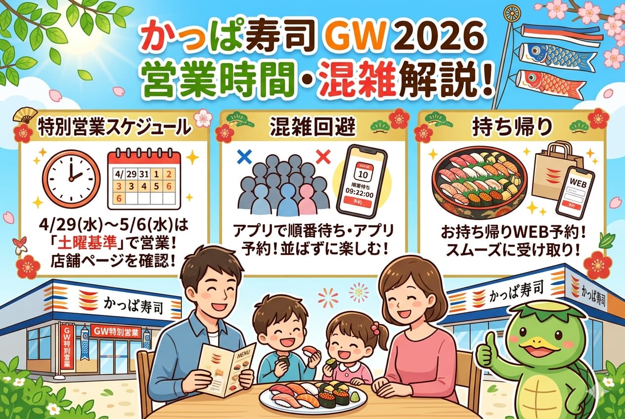 2026年のかっぱ寿司GW営業は、4月29日〜5月6日が土曜日営業時間基準です。