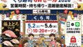 2026年のかっぱ寿司は、4月29日(水・祝)から5月6日(水・祝)までがGW特別営業の対象期間です。