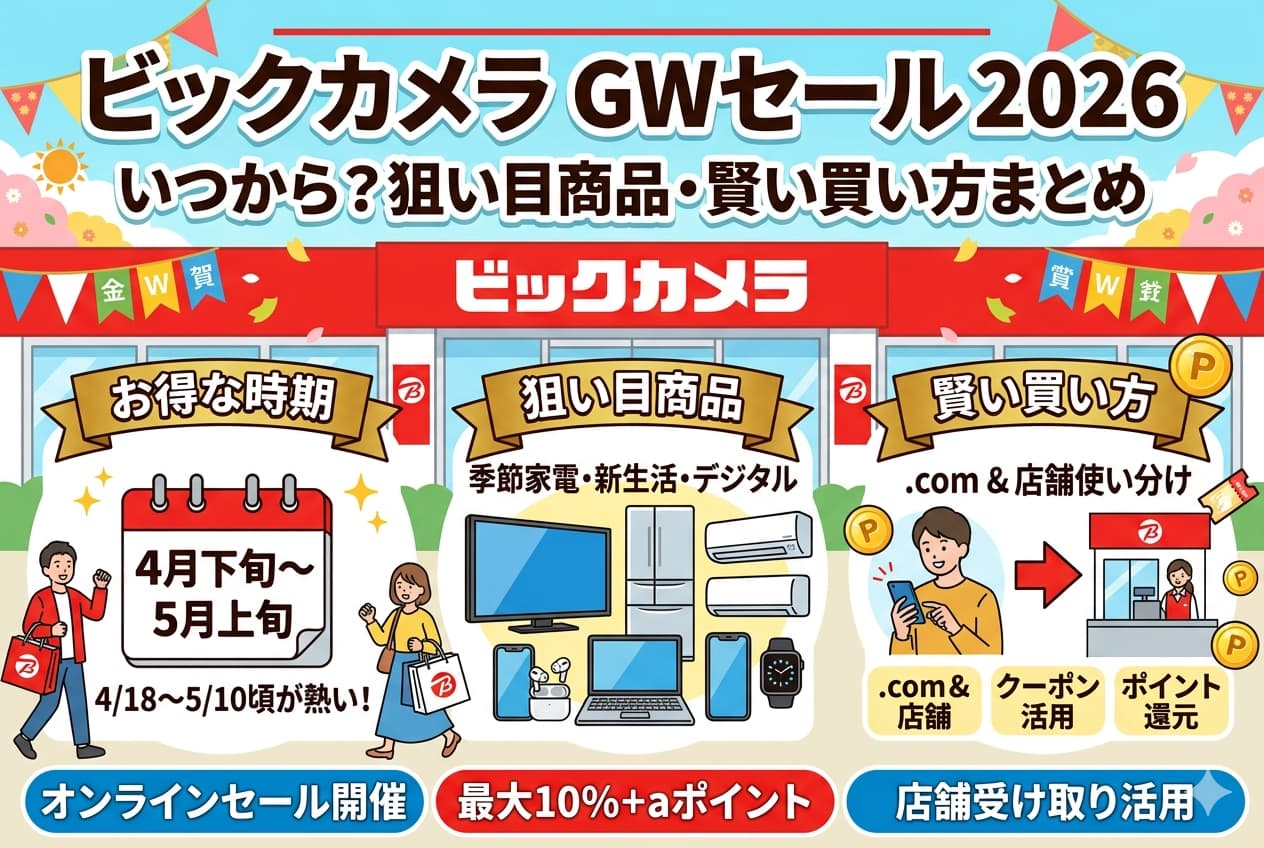 2026年のビックカメラGWセールは、4月下旬〜5月上旬が本番です。