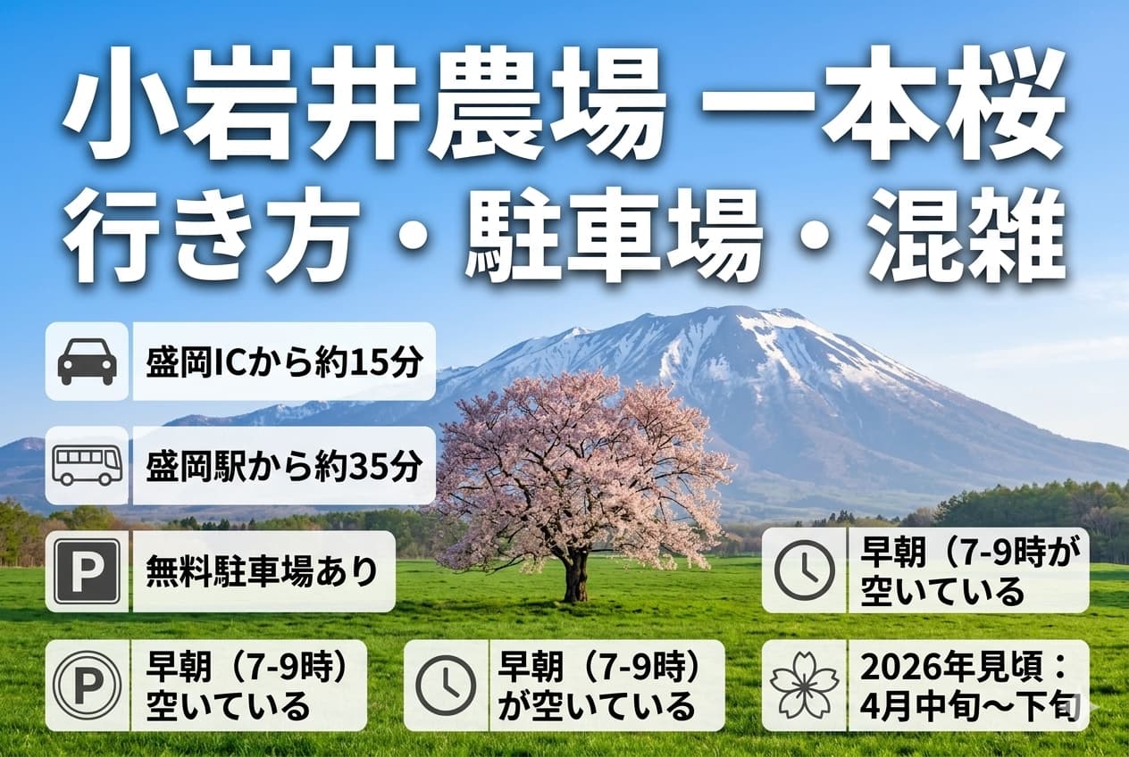 小岩井農場の「一本桜」は、写真好きの間でも話題のフォトスポットですが、「実際どうやって行くの?」「駐車場は混む?」と、初めて行く方はいろいろ気になりますよね。