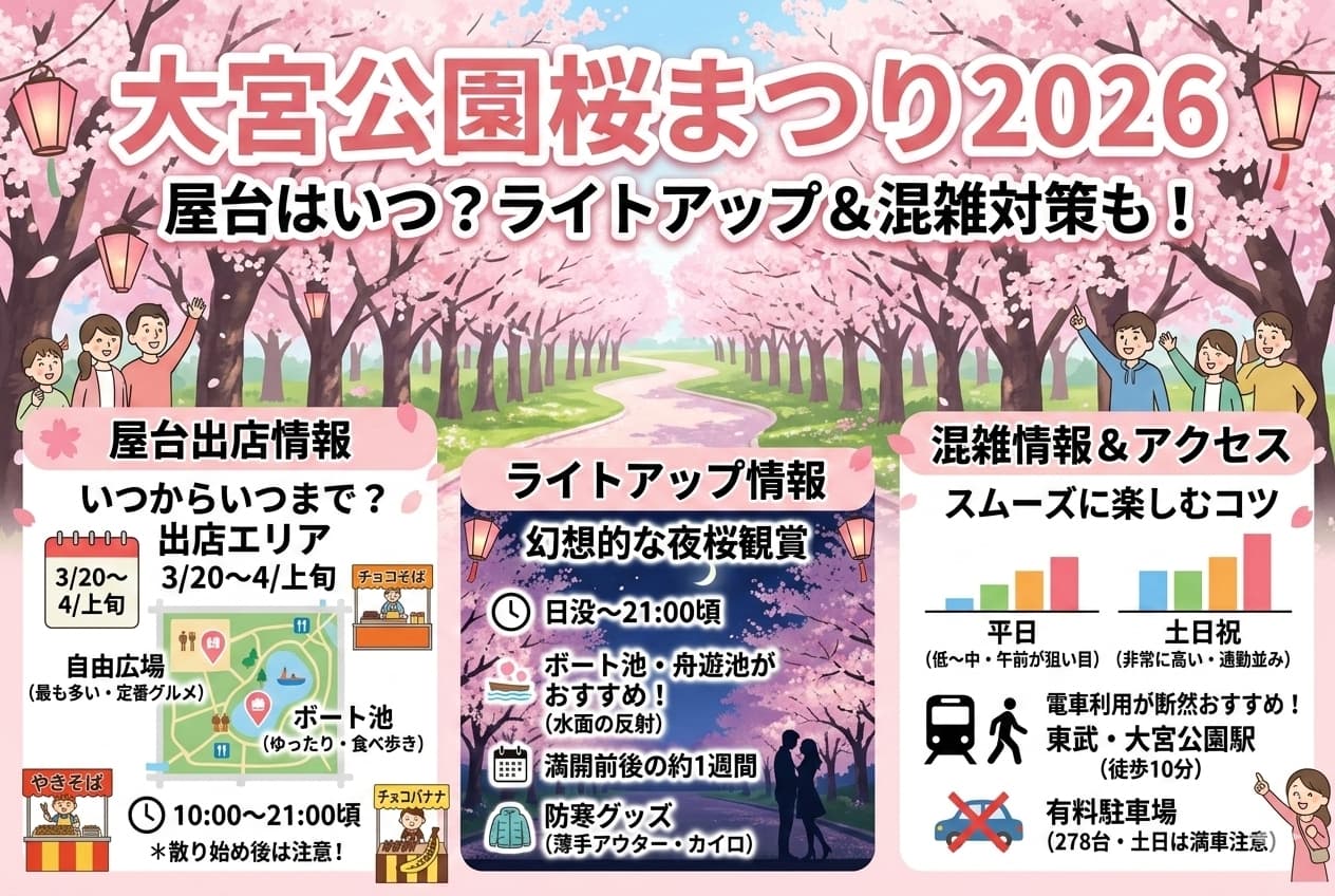 埼玉県さいたま市を代表する桜の名所、大宮公園。約1,000本以上の桜が咲き誇るこの公園は「日本さくら名所100選」にも選ばれており、毎年多くの花見客が訪れます。屋台グルメにライトアップ、そして満開の桜並木――。計画を立てて行くのと行き当たりばったりとでは、楽しさが全然違うと私は思っています。この記事では2026年の情報をわかりやすくまとめました。