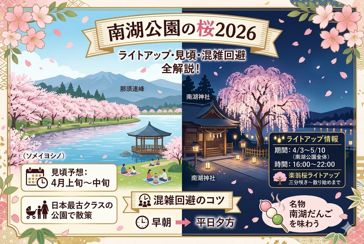 ライトアップは南湖公園全体で4月3日〜5月10日、楽翁桜は開花状況に合わせて実施される見込みです。