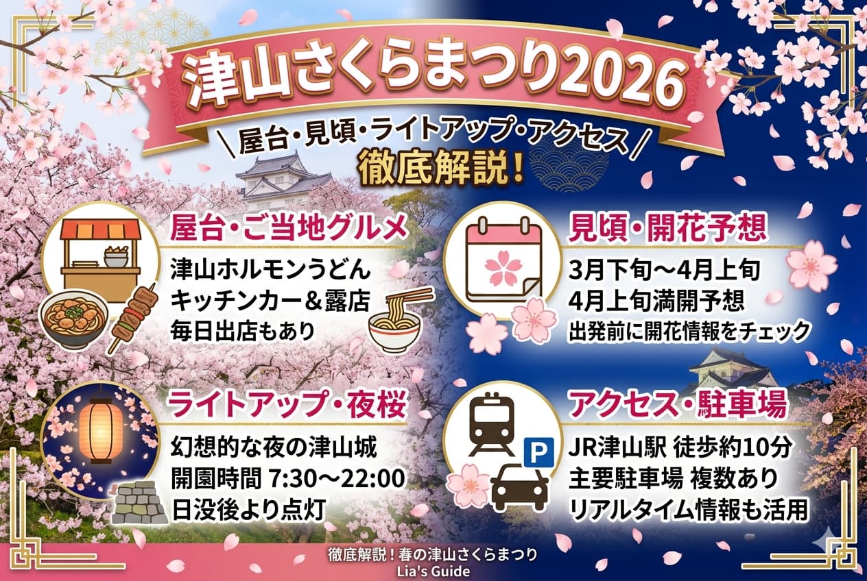 春の岡山旅で「津山さくらまつりが気になるけれど、屋台やアクセスは実際どうなの?」と迷う方へ向けて、公式情報を軸に、2026年版をやさしく整理しました。