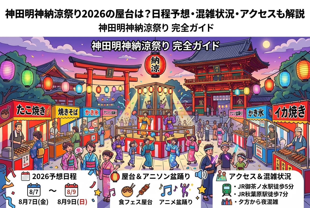 神田明神納涼祭り2026は、現時点では詳細未発表の部分があるものの、例年の流れから見ると8月上旬の3日間開催になる可能性が高そうです。屋台は境内中心、グルメは食フェス寄り、そして夕方からのアニソン盆踊りが最大の見どころ。