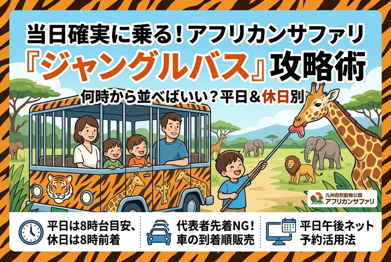 私なら「ジャングルバス最優先で朝に動く」「ダメでもマイカーに切り替える」の二段構えで行きます。