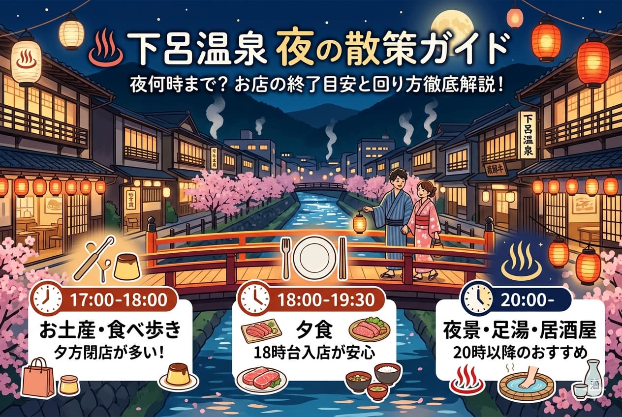 夕食は18時台スタートがいちばんきれいに回れます。食事を終えたころに温泉街の灯りが映えてきて、旅館の明かりや川沿いの空気がぐっとロマンチックになります。20時台を過ぎると食事の選択肢が減るので、夜散歩を楽しみたい人ほど、夕食は早めが向いています。