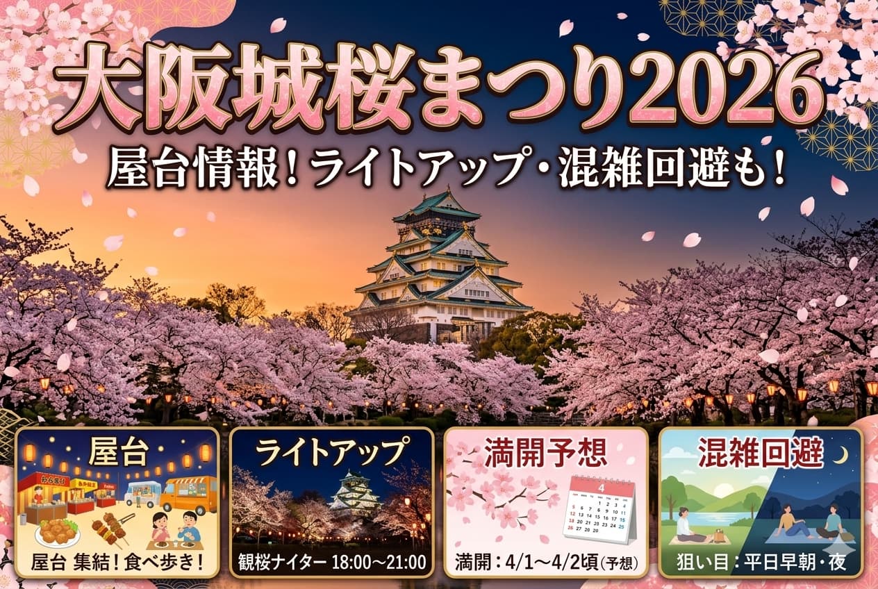 この記事では、2026年の大阪城桜まつりの屋台情報から、ライトアップの期間・時間、混雑の回避策、アクセスまでまとめてお届けします。