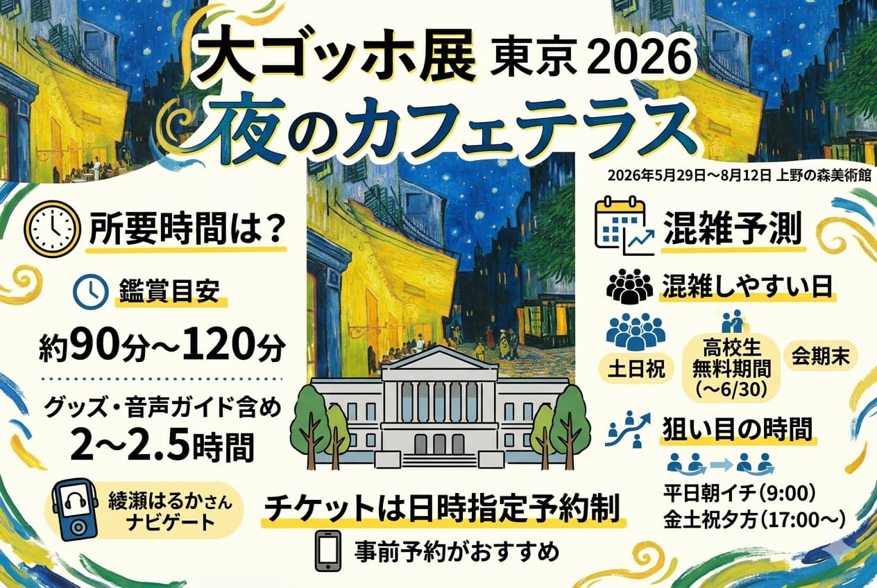 そこで今回は、東京開催の「大ゴッホ展 夜のカフェテラス」を、所要時間・混雑・チケットの3つを中心に、できるだけ実用的に書いていきます。