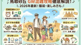 未分類 鳥取砂丘のゴールデンウィークの混雑状況は?服装や周辺施設を利用した楽しみ方も解説 鳥取砂丘って、行くだけならシンプルに見えますよね。でもGWは話が別です。駐車場、道路、歩きやすい服装、周辺の回り方まで、事前に知っているかどうかで満足度がかなり変わります。私自身、家族で混む時期に出かけるときは「現地で困らないこと」がいちば... 2026.04.23 未分類